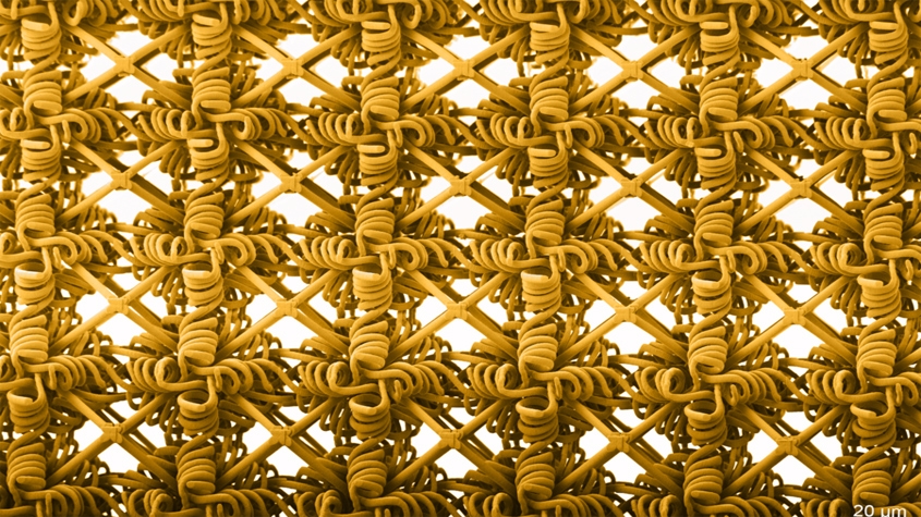 For their new study, the team fabricated a metamaterial by combining two microscopic architectures. The first is a rigid, grid-like scaffold of struts and trusses. The second is a pattern of coils that weave around each strut and truss. Both networks are made from the same acrylic plastic and are printed in one go, using a high-precision, laser-based printing technique called two-photon lithography.